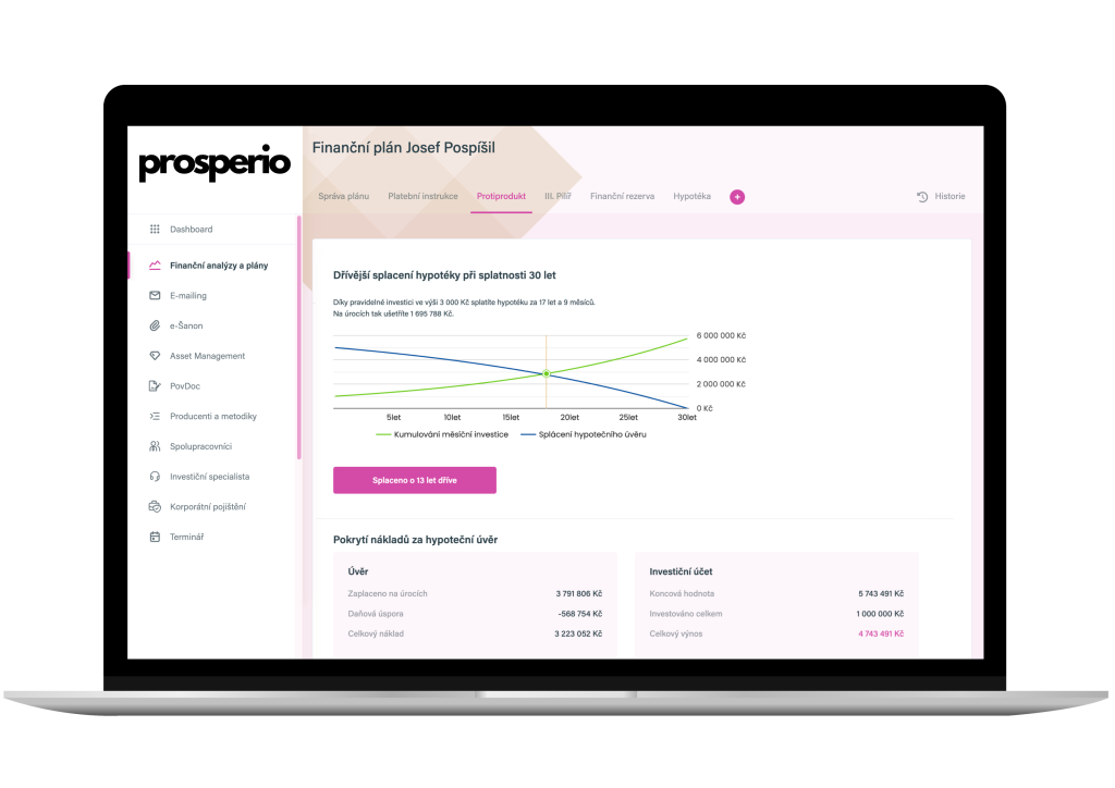 Prosperio finanční plán je jednoduchá a přehledná aplikace, která našim specialistům usnadňuje tvorbu finančních plánů a přípravu podkladů pro klienty. Všechny potřebné dokumenty jsou tak vždy na jednom místě a kdykoliv k dispozici. Navíc bez zbytečných kartonových šanonů či kartoték.